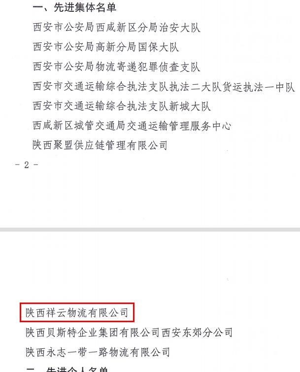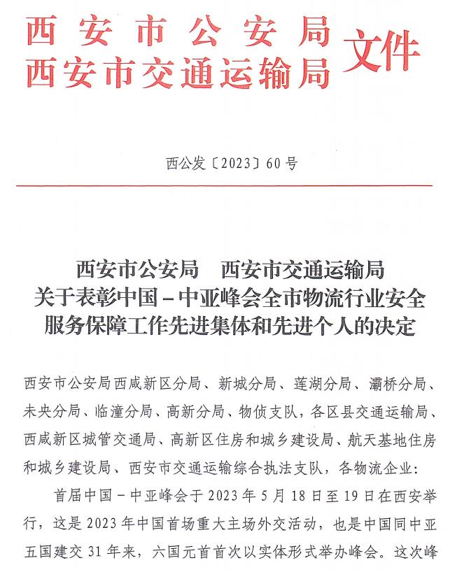 2023年6月6日,西安市公安局、交通运输局发布表扬通报,对中国-中亚峰会期间,为全市物流行业安全服务保障工作做出贡献的先进集体和先进个人进行表彰,陕西祥云物流有限公司获得“服务保障中国—中亚峰会先进集体”荣誉称号。