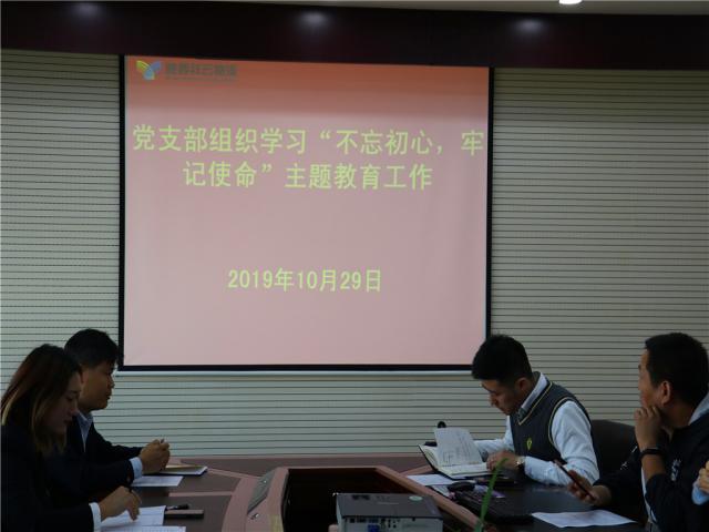 为贯彻落实《中共陕西省市场监督管理局非公经济组织委员会直属党委开展“不忘初心、牢记使命”主题教育实施方案》,深入学习贯彻习近平新时代中国特色社会主义思想,加强革命传统教育,增强全体党员群众责任意识和爱国情怀,全面把握守初心、担使命、找差距、抓落实的要求,使党员群众增强“四个意识”、坚定“四个自信”、做到“两个维护”,自觉在思想上、政治上同以习近平同志为核心的党中央保持高度一致。2019年10月29日下午,陕西祥云物流党支部积极召集公司党员及全体员工开展“不忘初心,牢记使命”主题教育工作。