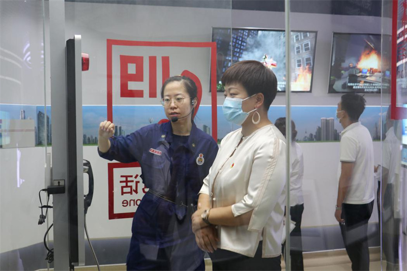 在副支队长张芳赟的陪同下,孙婷、沈卫斌一行参观了消防展览室。讲解员介绍了各种消防器具的名称和用途,并现场操作演示,使大家对消防器具的使用有了更进一步的认识;接着还模拟火灾逃离、绳索自救、地震疏散等场景,讲解自救相关技巧。